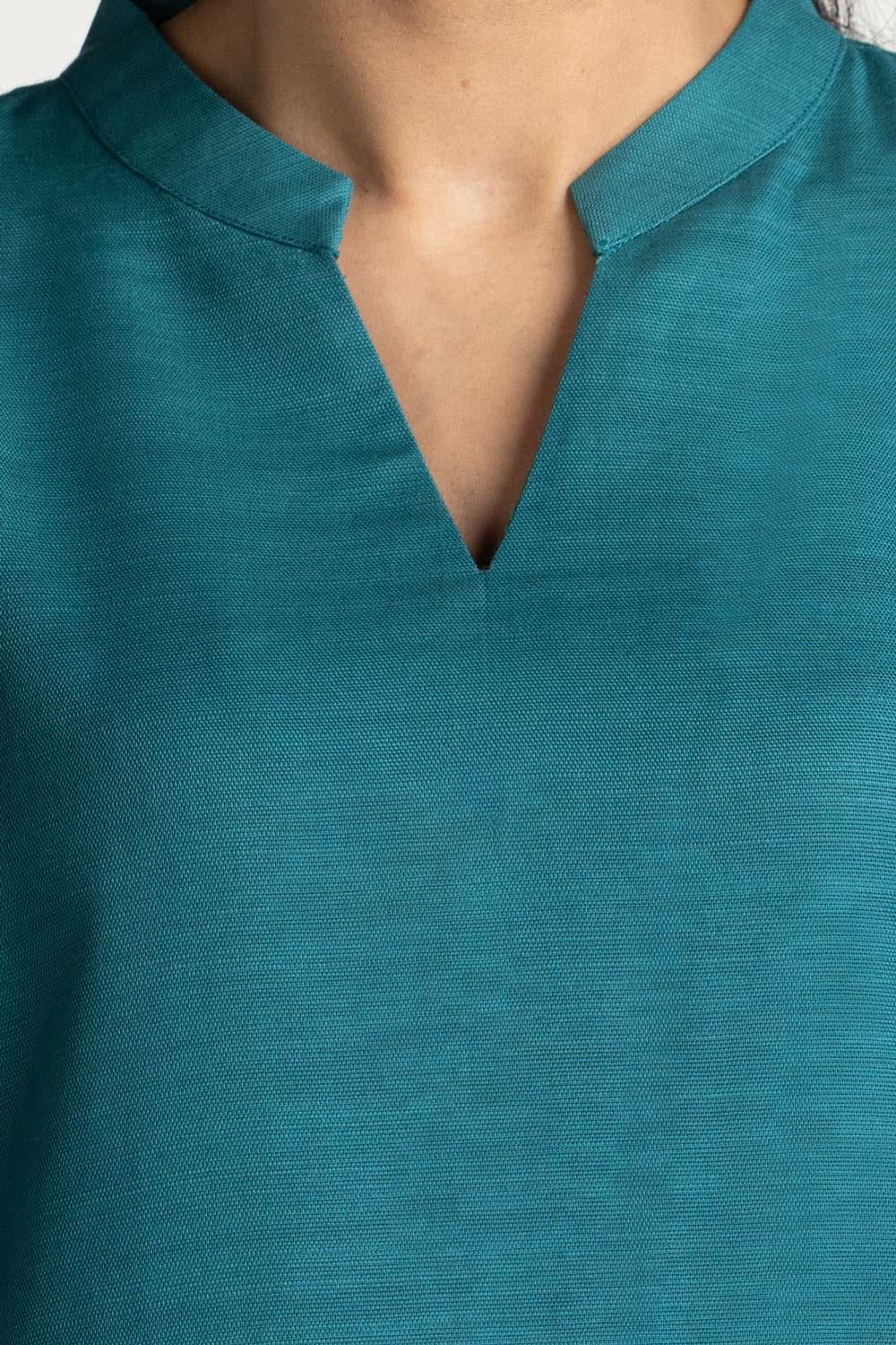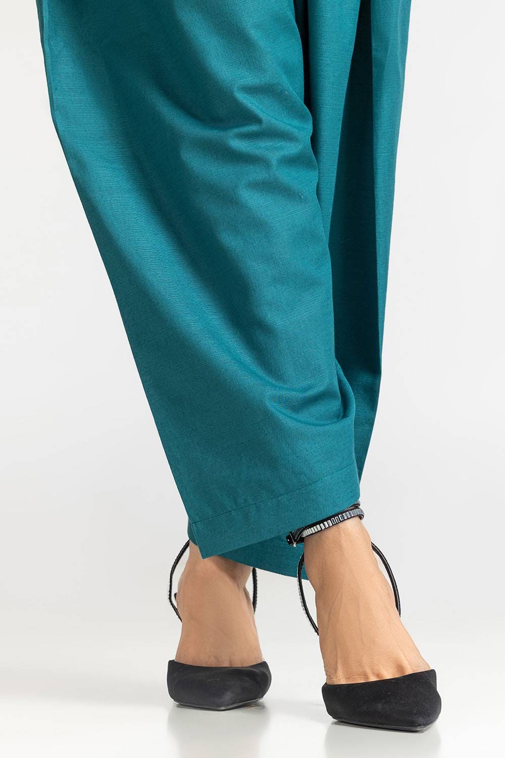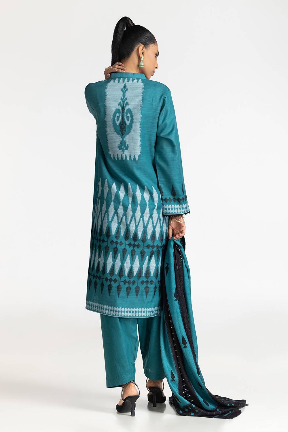 This blue geometric design set features a round neck with button closure and straight sleeves. The shalwar and matching dupatta make it a bold and modern statement.