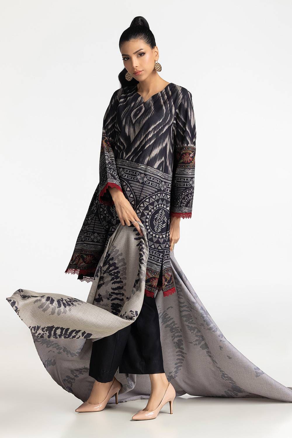 This 3PC black suit with detailed design adds a bold touch. Paired with a striking dupatta, and straight pants, it creates a stunning ensemble that’s perfect for winter evenings.