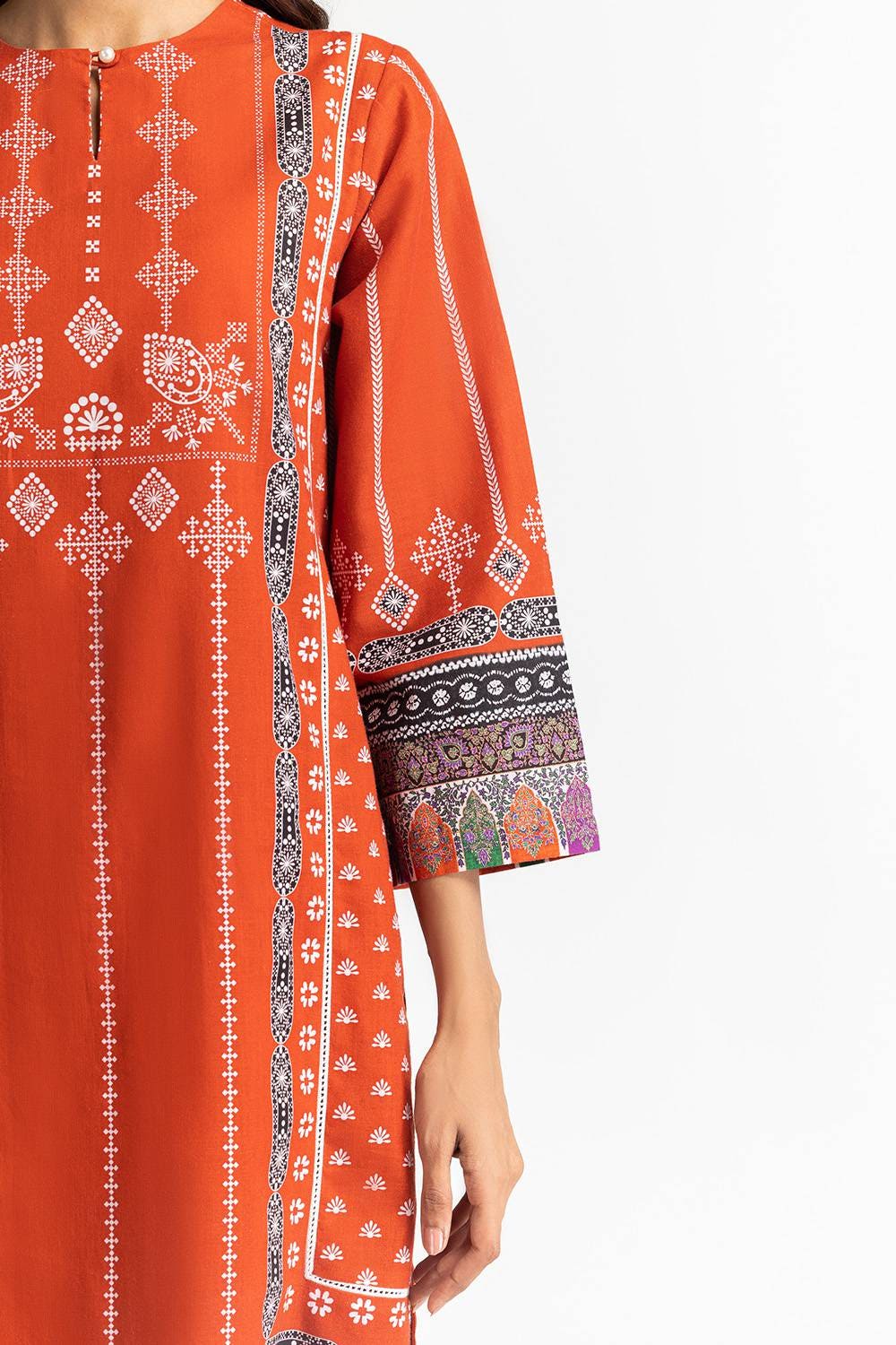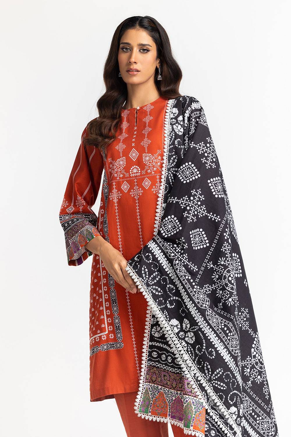 This vibrant 3PC orange outfit paired with a contrasting black printed dupatta brings modern style to tradition. The bold patterns and lively hues make it a perfect pick for festive days.