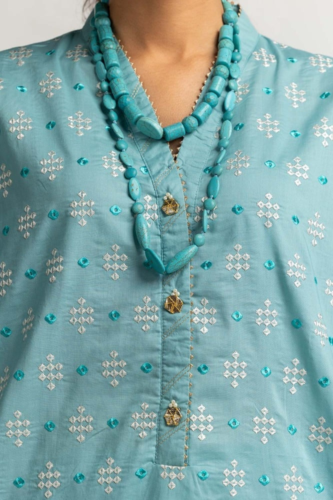 Ready to wear Embroidered lawn shirt featuring a v neck with collar, straight hemline and straight sleeves with light embelishment. Paired with a matching printed dupatta and a plain trouser.