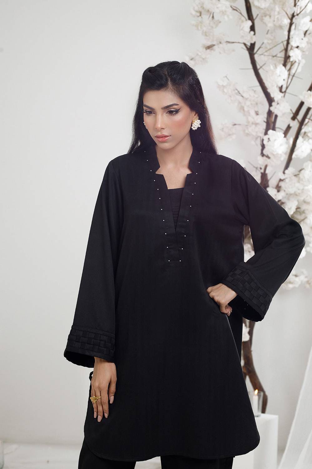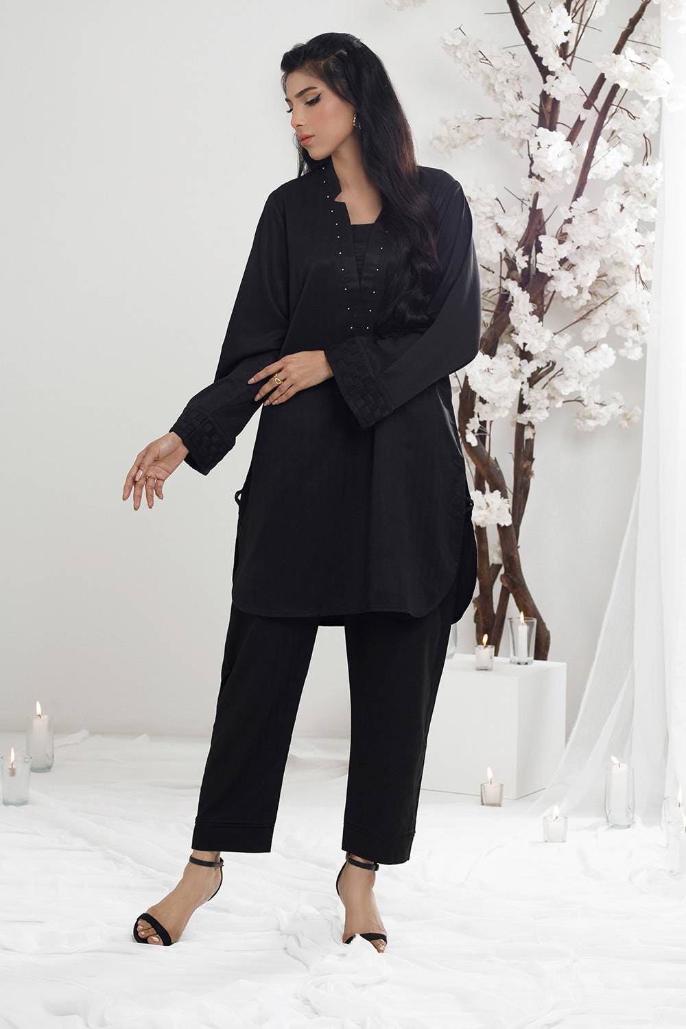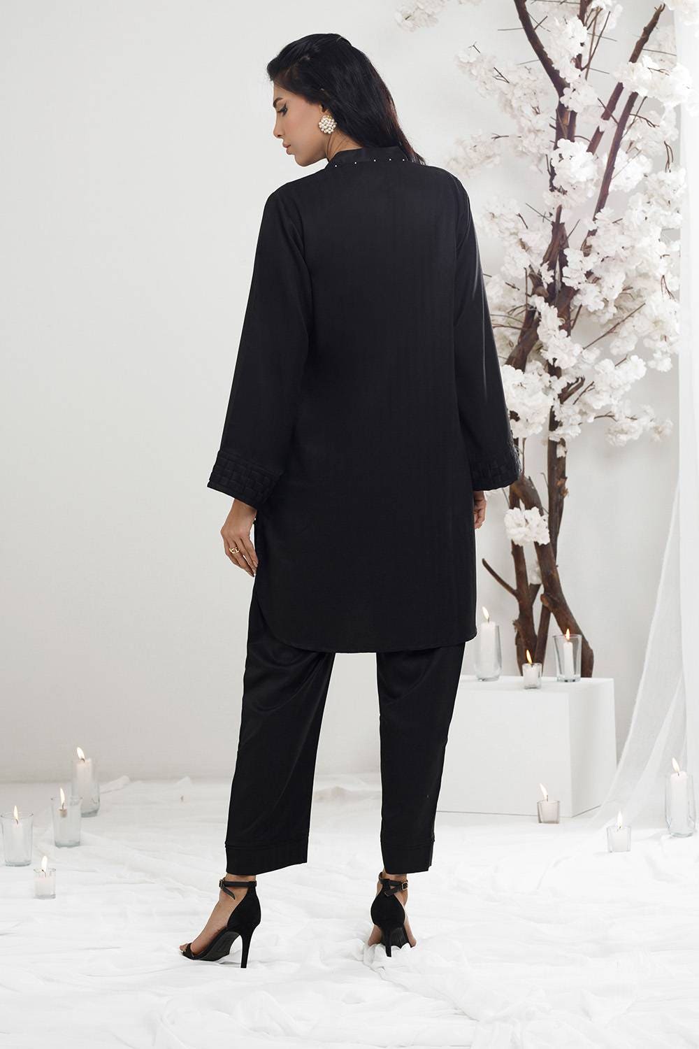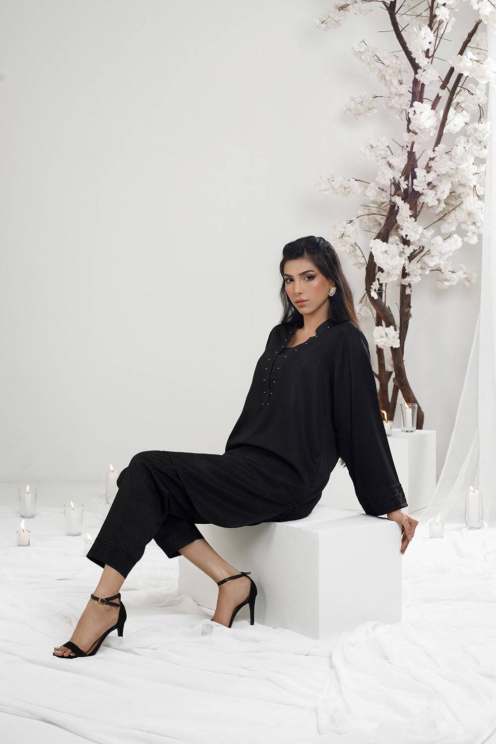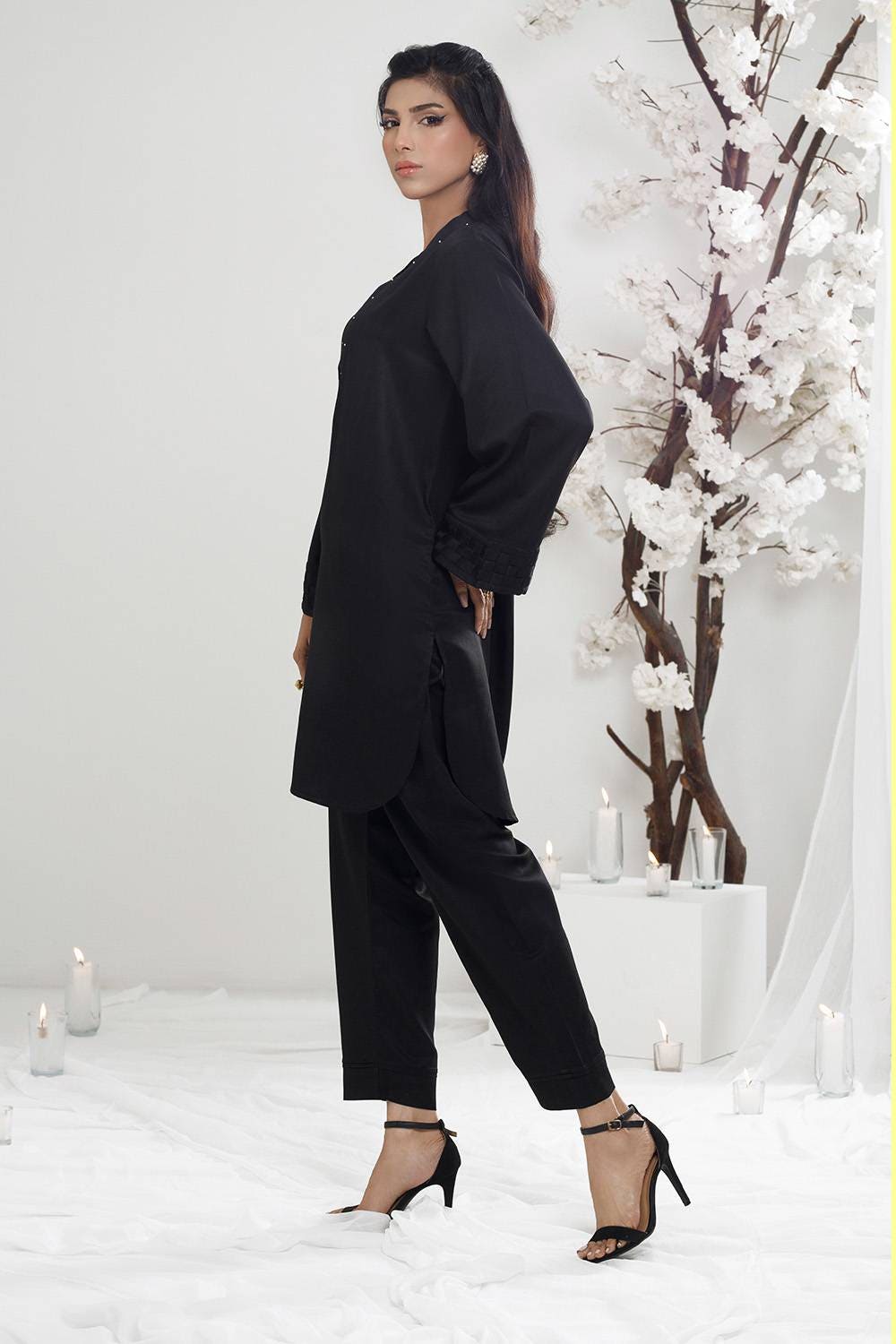 Embrace elegance with this black V-neck Co-Ord set with button details, wide sleeves, and a straight hem, paired with sleek straight-leg pants for a timeless, chic ensemble.