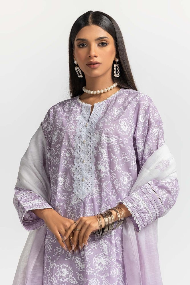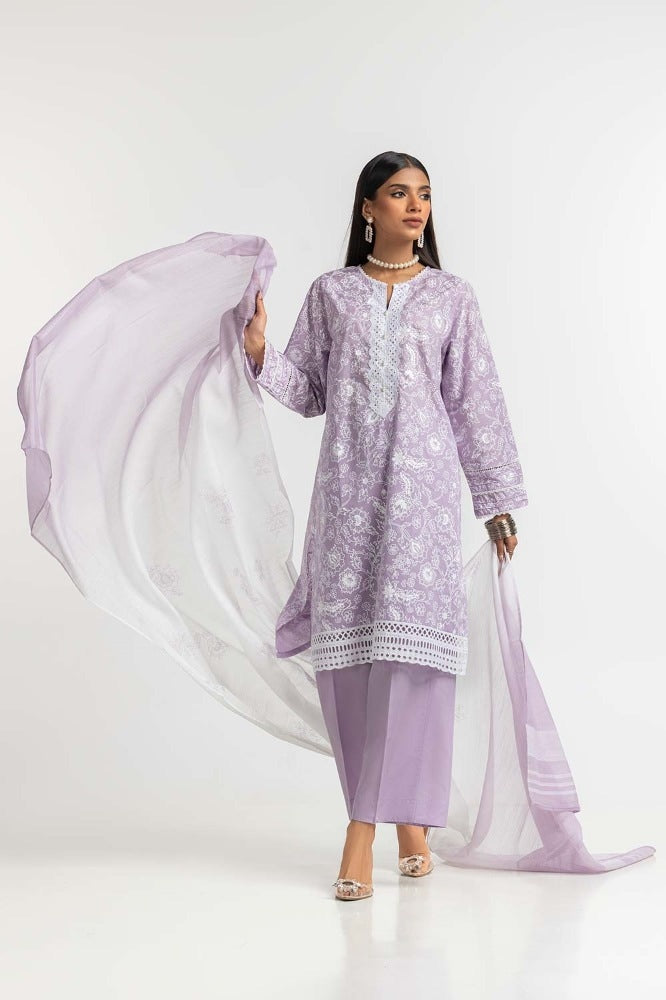 Printed Schiffli Embroidered Lawn Shirt Cotton Dupatta Dyed Trouser KJP-43187