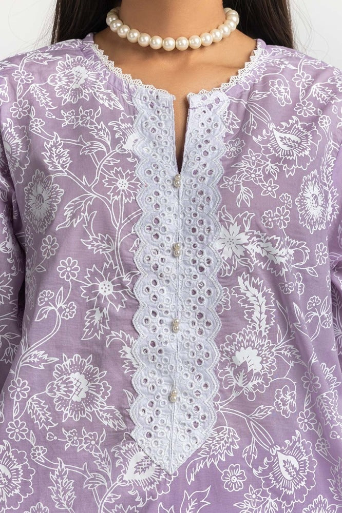 Ready to wear Embroidered lawn shirt featuring a round neck with V and buttons, straight hemline and straight sleeves with lace. Paired with a matching printed dupatta and a plain trouser.