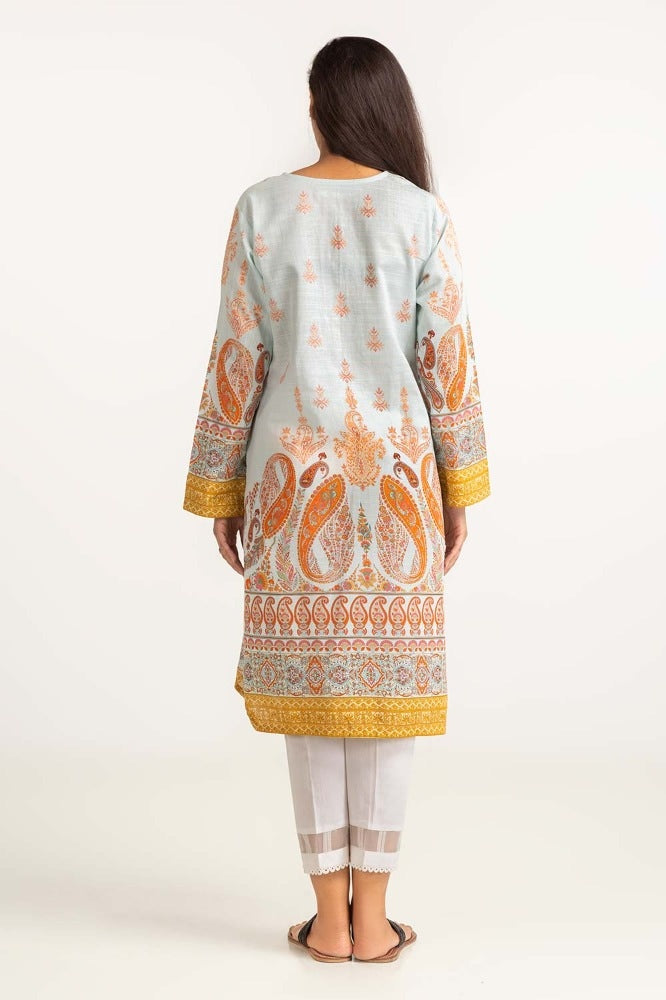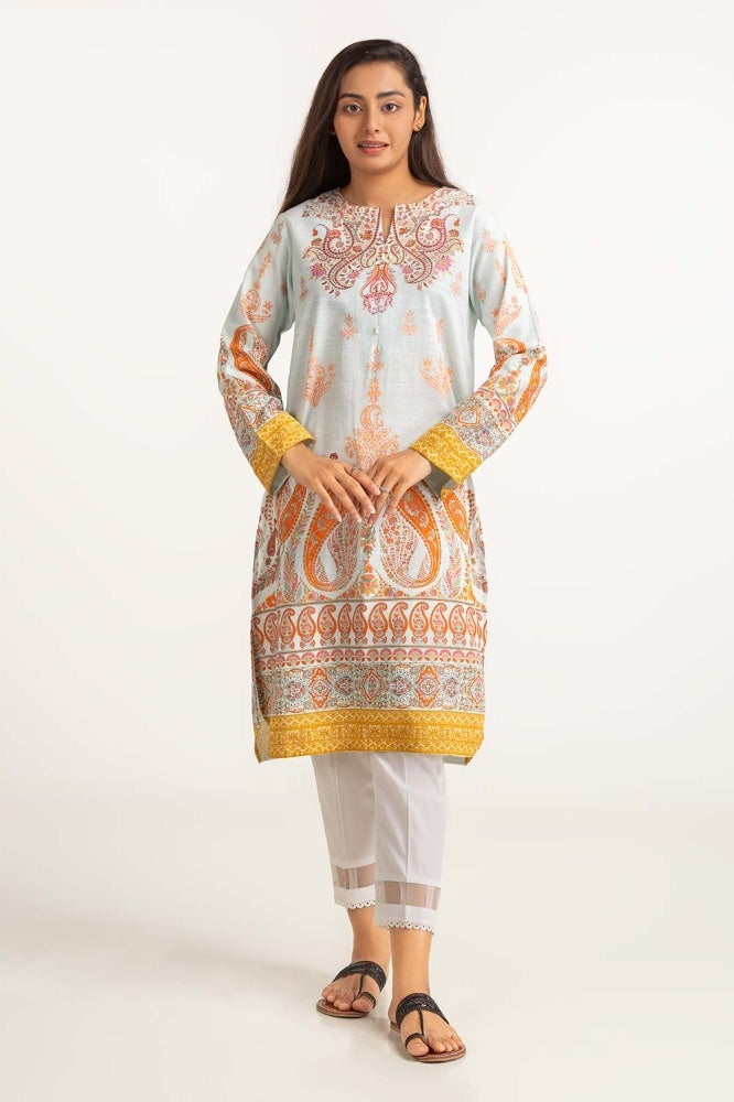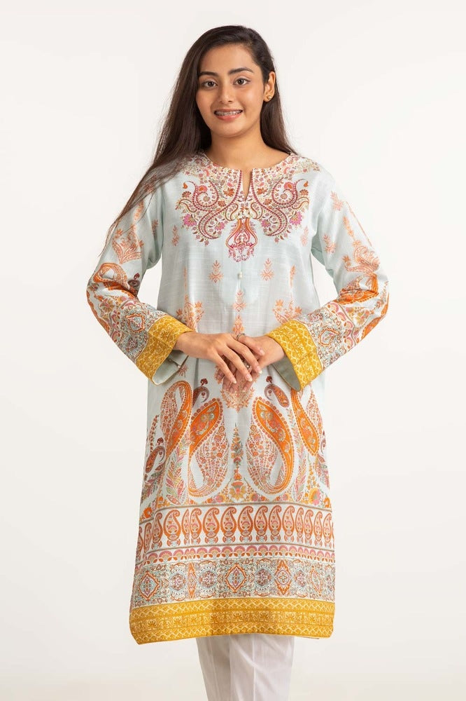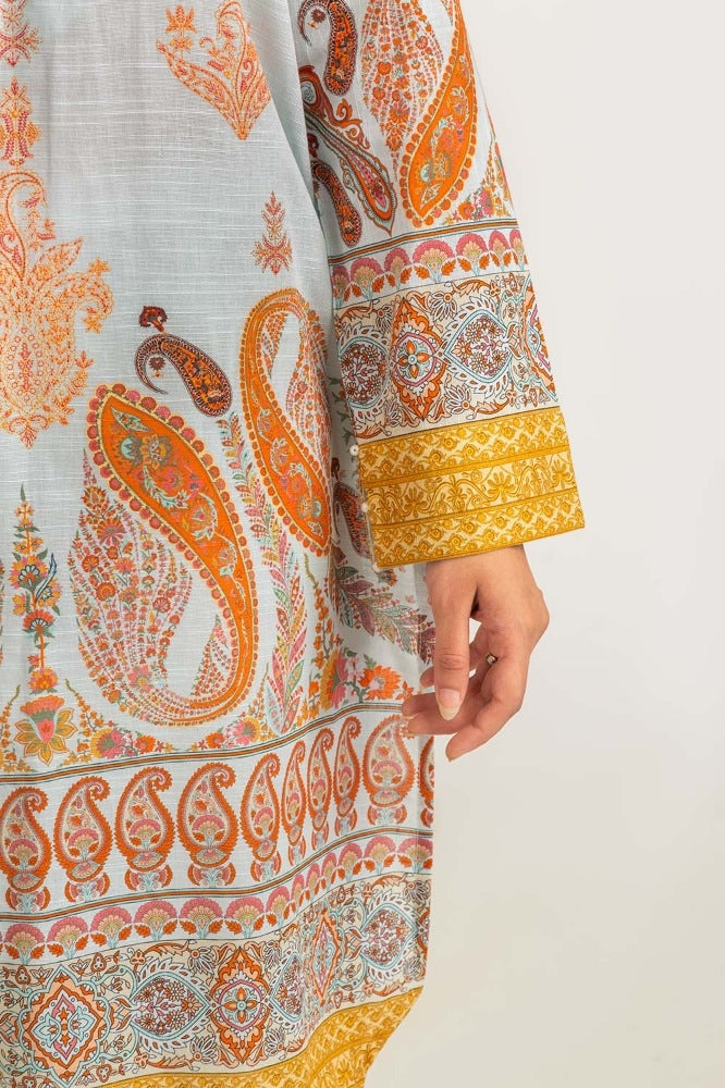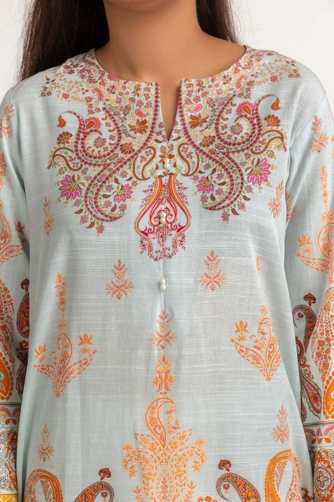Ready to wear Digital Printed Khaddar straight cut shirt with plain round neckline and sleeves embellished with pearls.