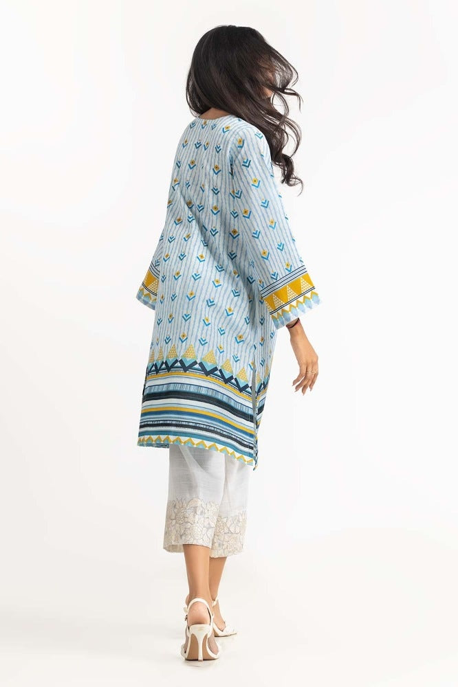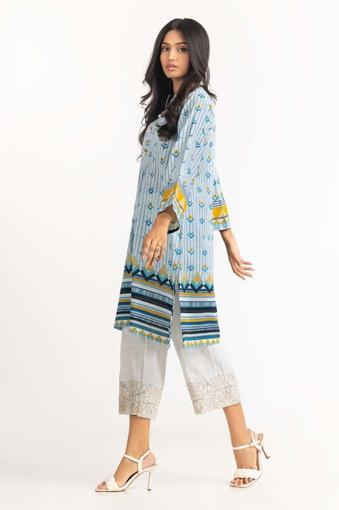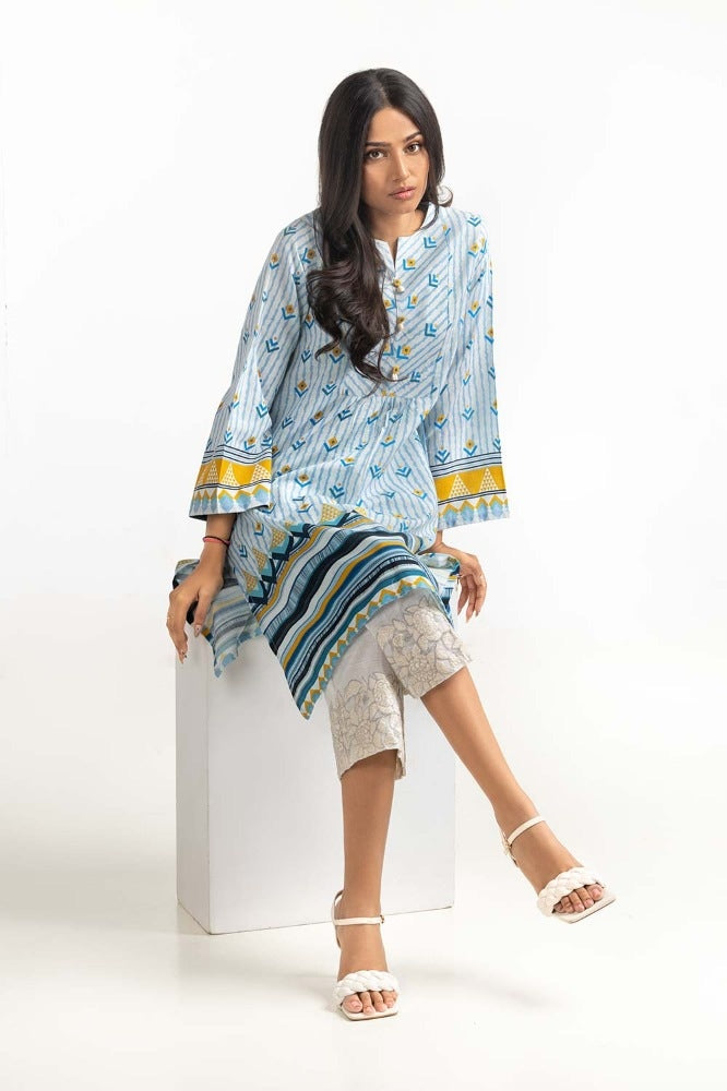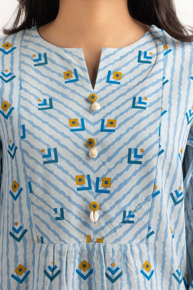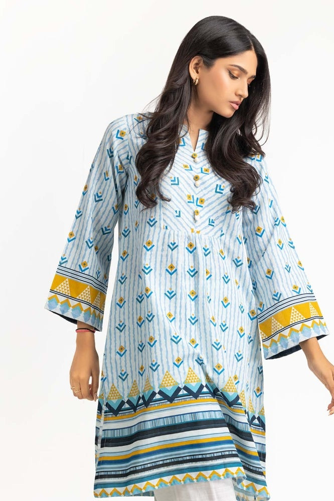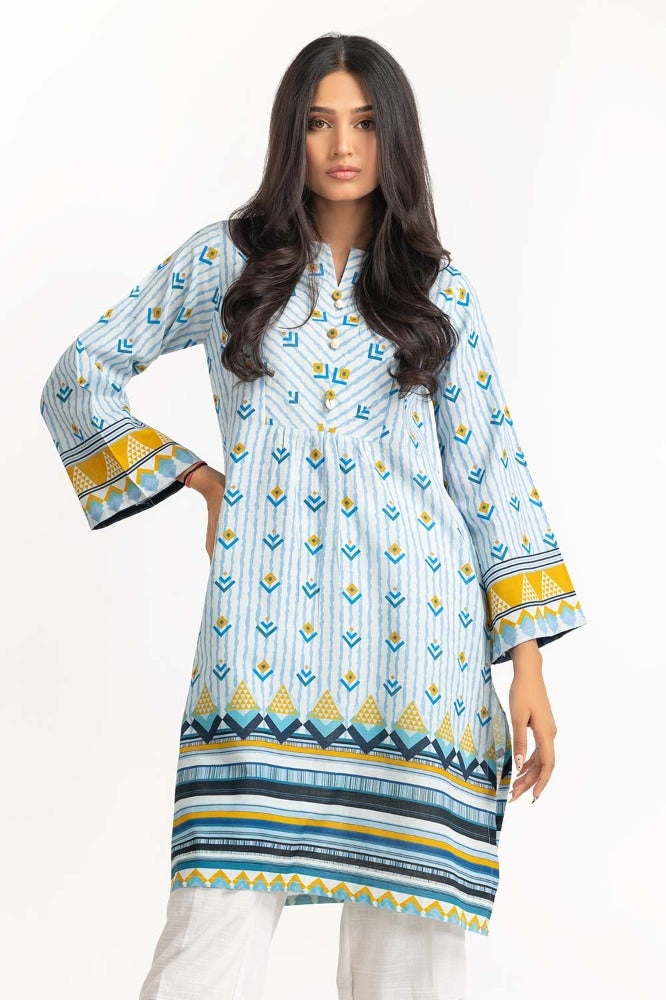 Ready to wear Digital Print Khaddar Shirt with a round neckline, pipen followed by buttons, light gathers in the middle and loose sleeves.