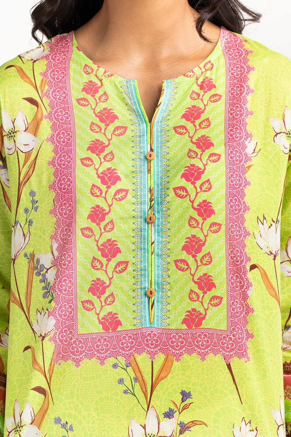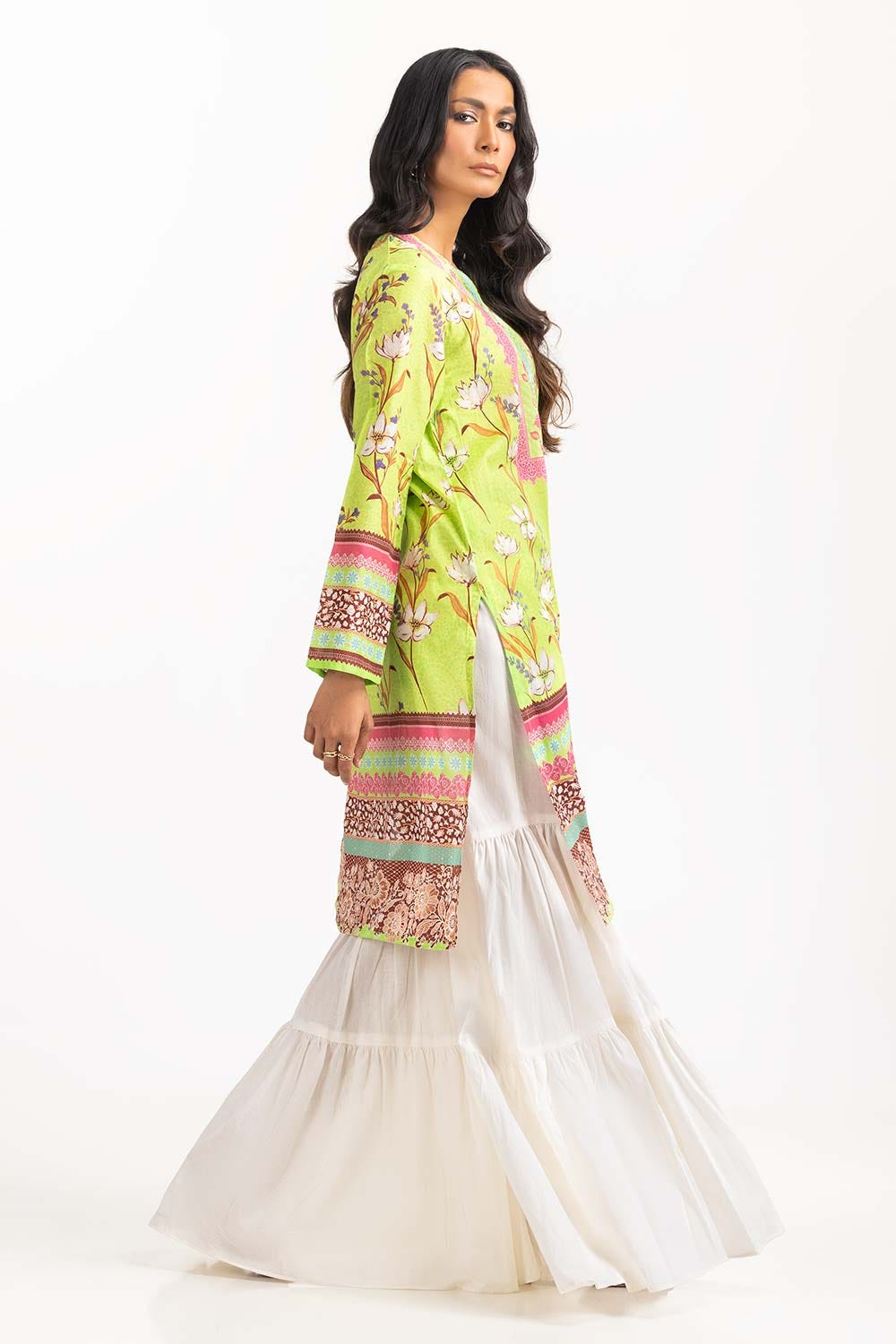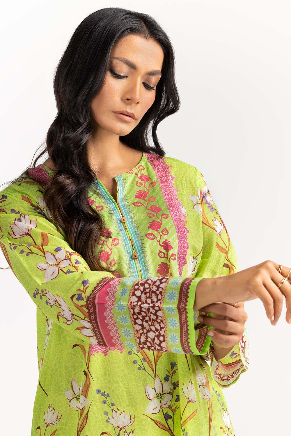 Multi-colored digitally printed cambric shirt featuring a round neck with detailing, straight sleeves and a rectangular hem.
