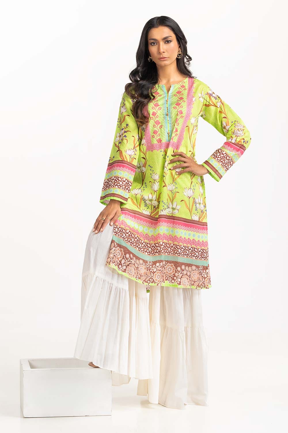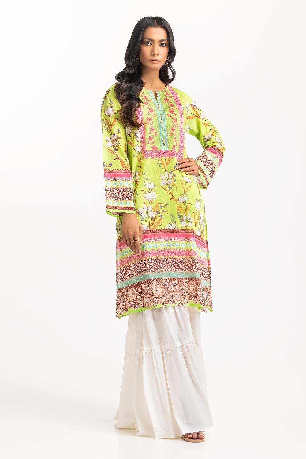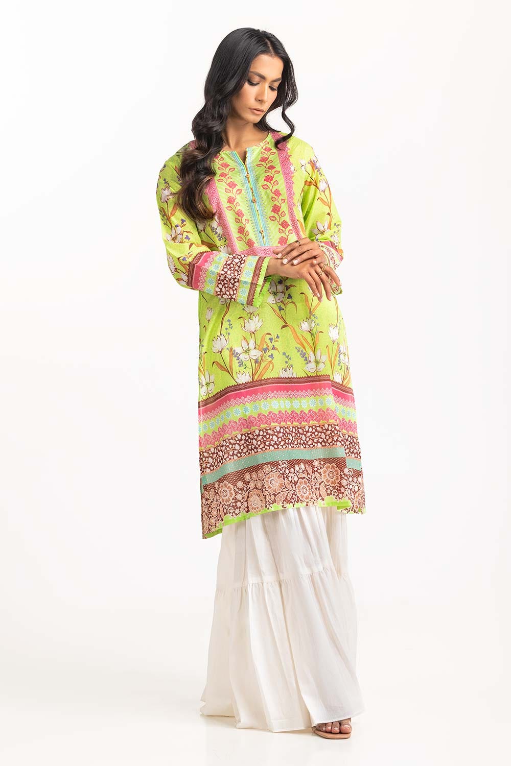 Multi-colored digitally printed cambric shirt featuring a round neck with detailing, straight sleeves and a rectangular hem.
