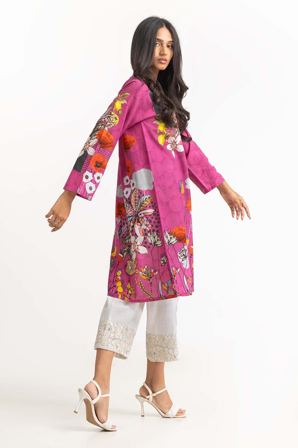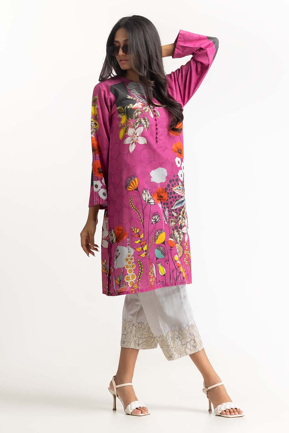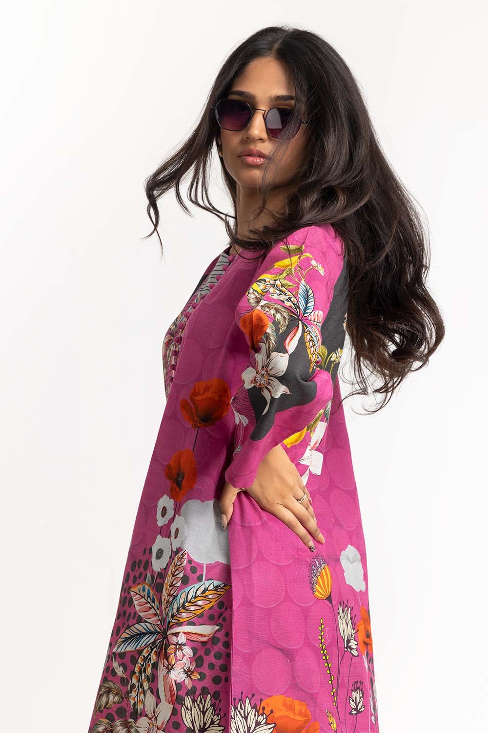 Ready to wear Digital Floral Printed Khaddar shirt with closed side seams and looped buttons qued on neckline.