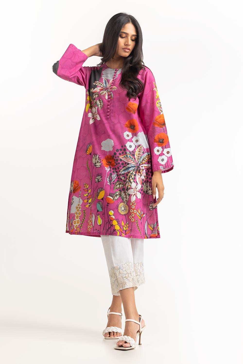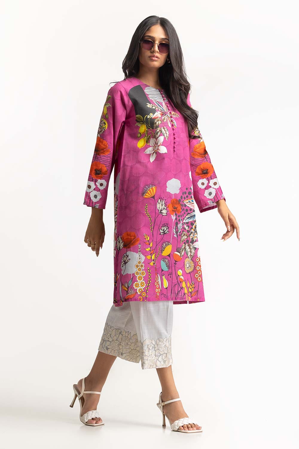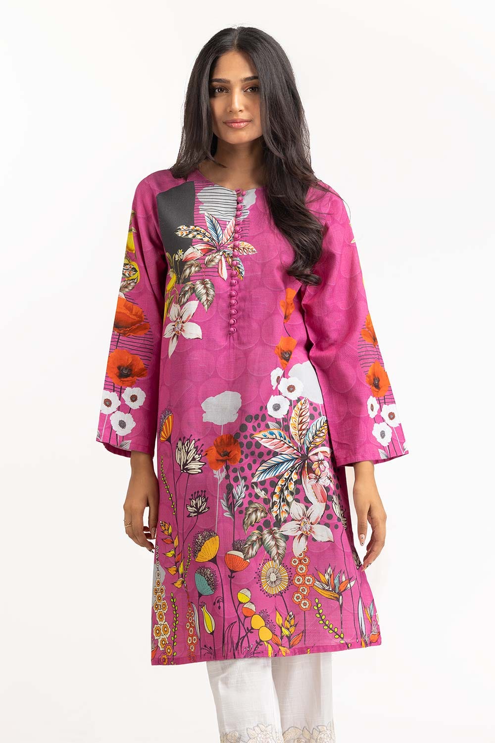 Ready to wear Digital Floral Printed Khaddar shirt with closed side seams and looped buttons qued on neckline.