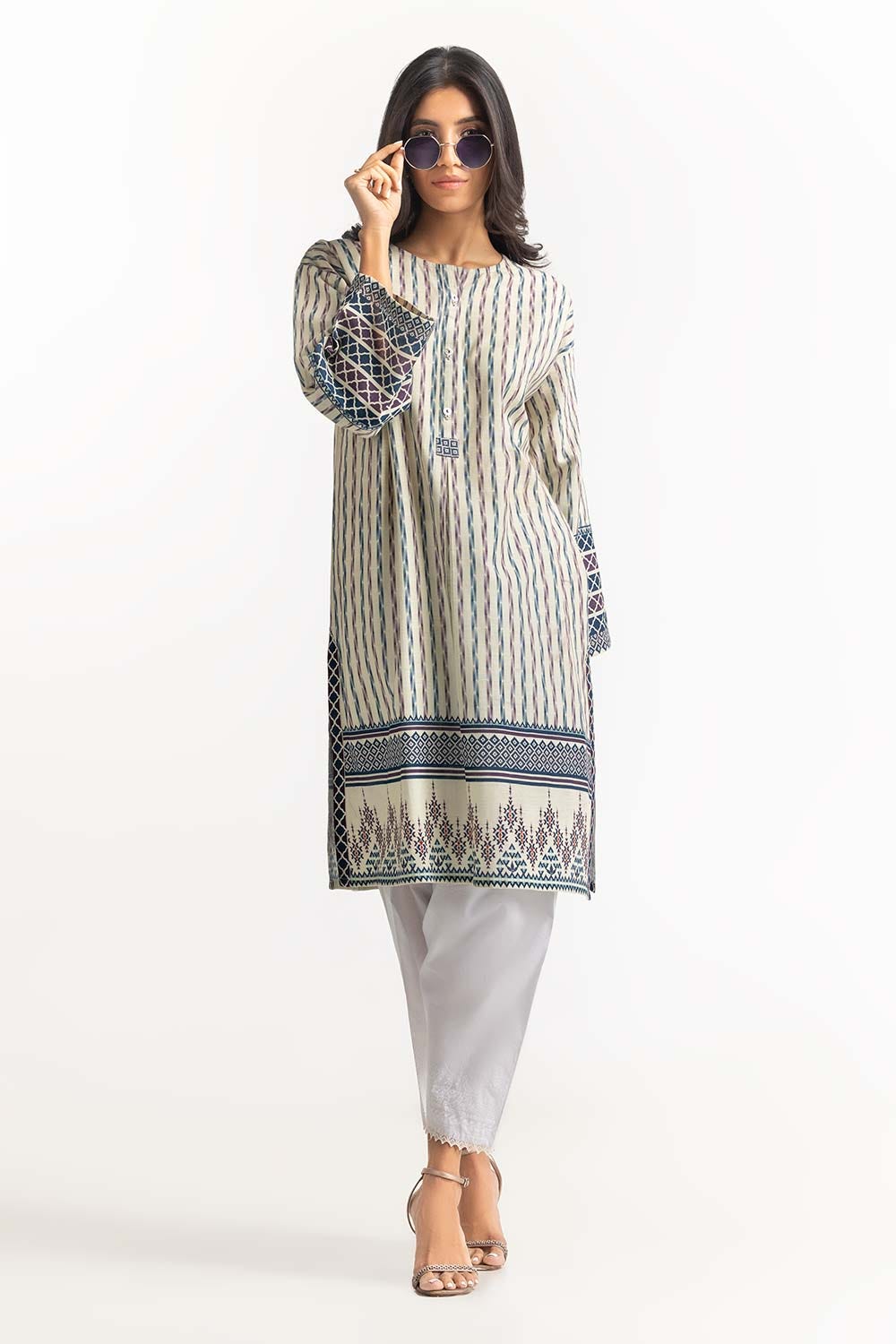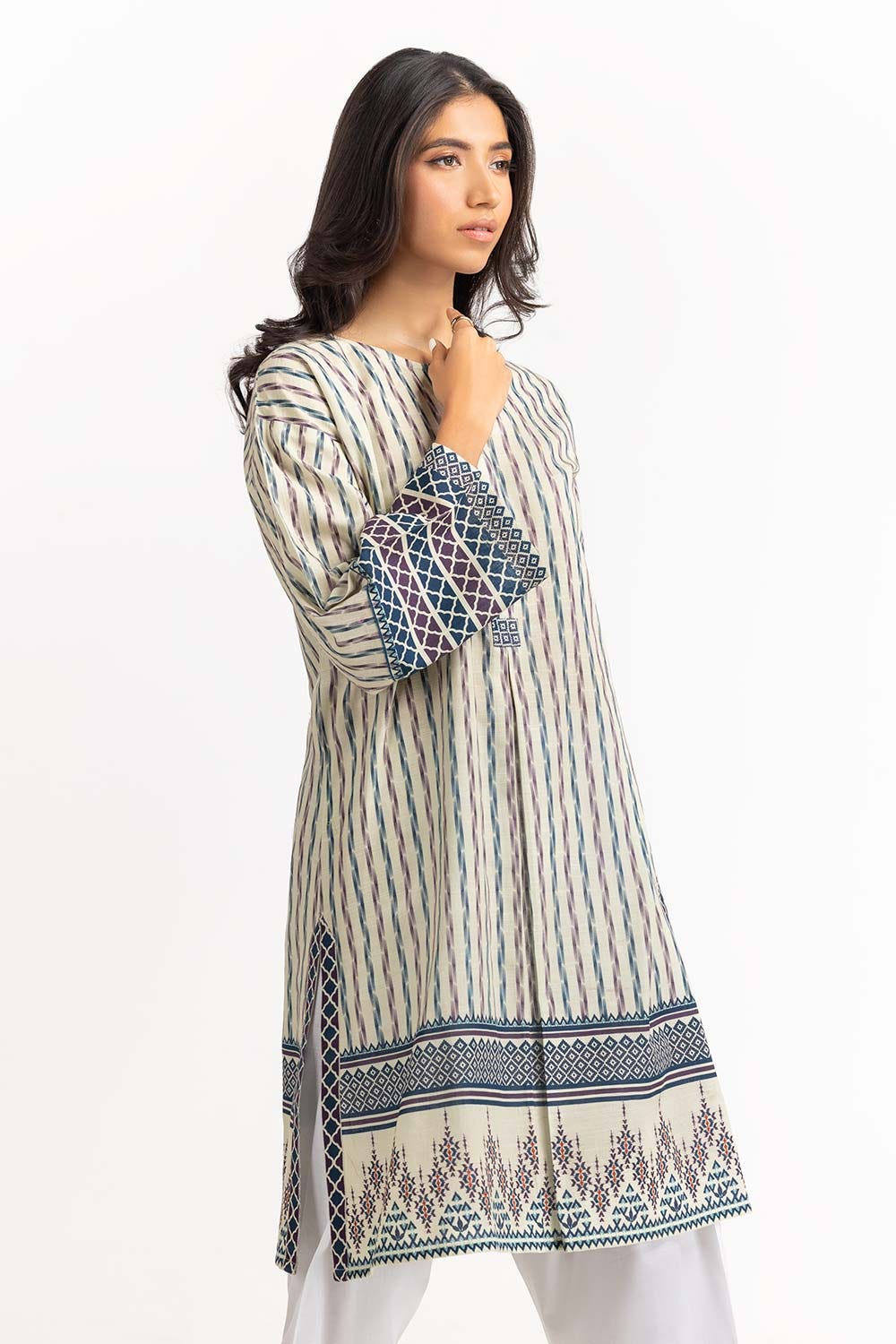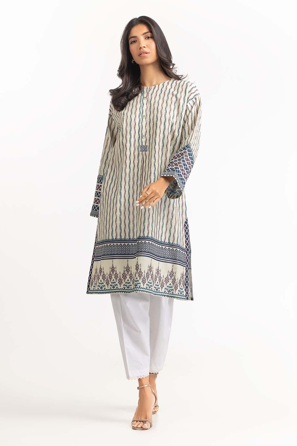 Ready to wear Digital Printed Khaddar Shirt featuring simple round neckline and straight broad sleeves.