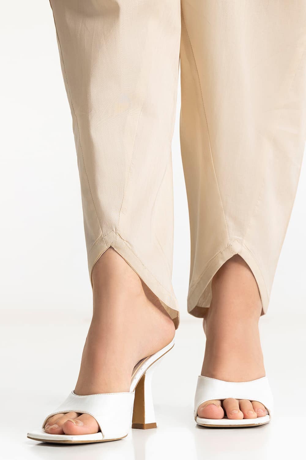 These beige tulip pants offer a contemporary twist with their unique cut and hem design. Perfect for adding a stylish edge to your traditional outfits, they are both chic and comfortable.