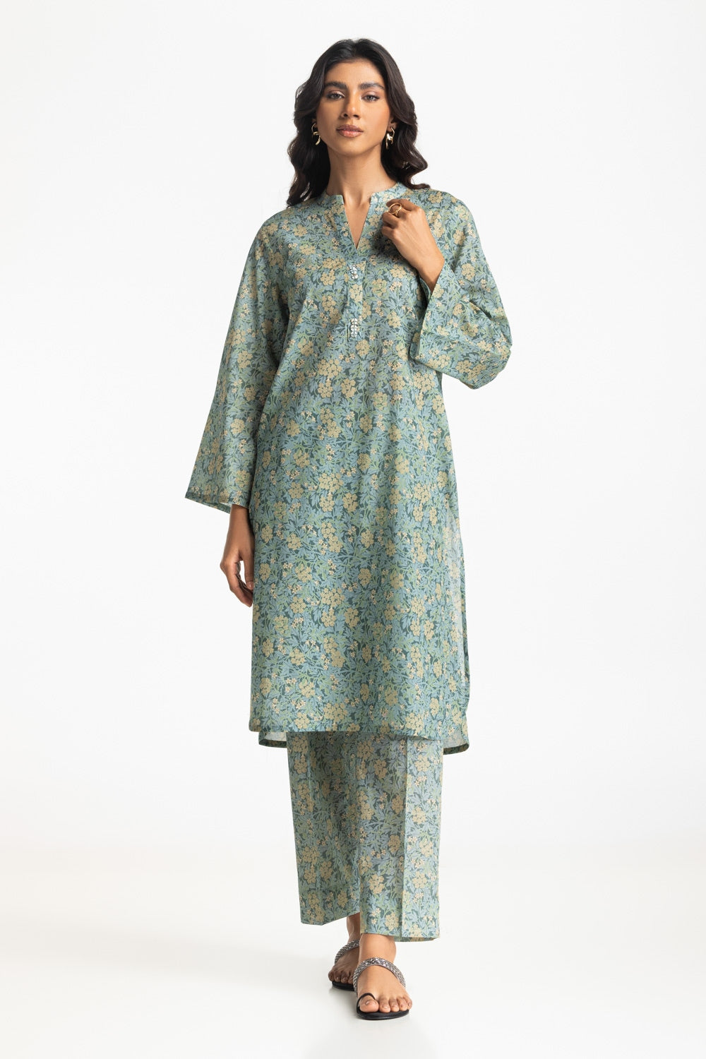 Bloom beautifully in this co-ord set with a floral print, featuring a regular fit shirt with a V - Neckline, complemented by matching trousers. Ideal for casual outings throughout the season.