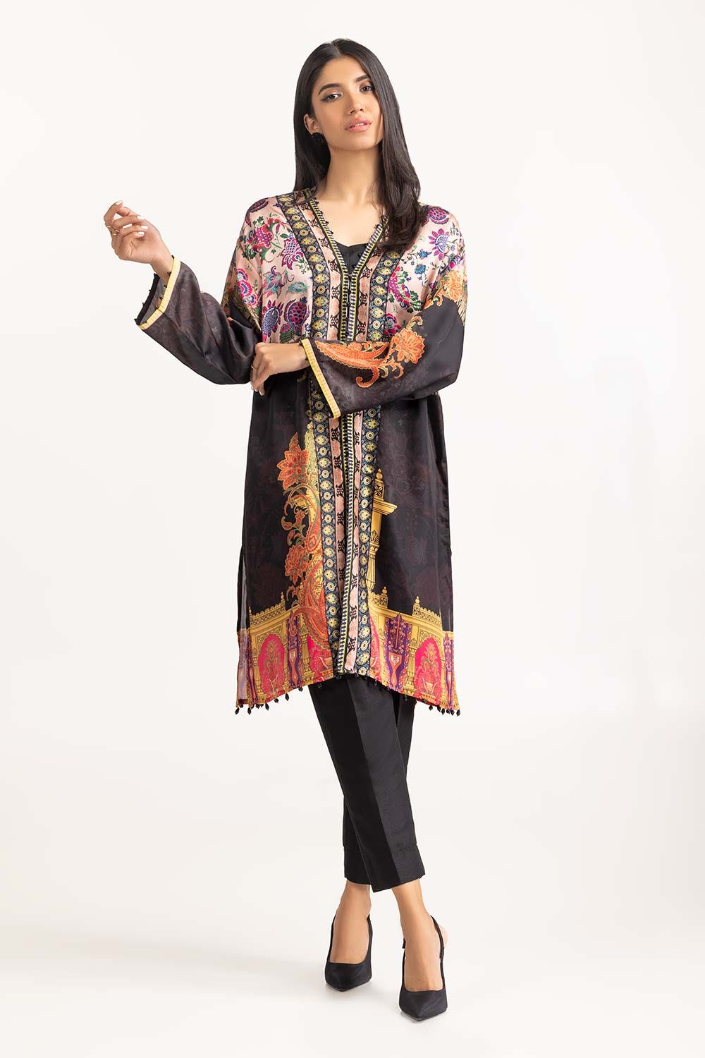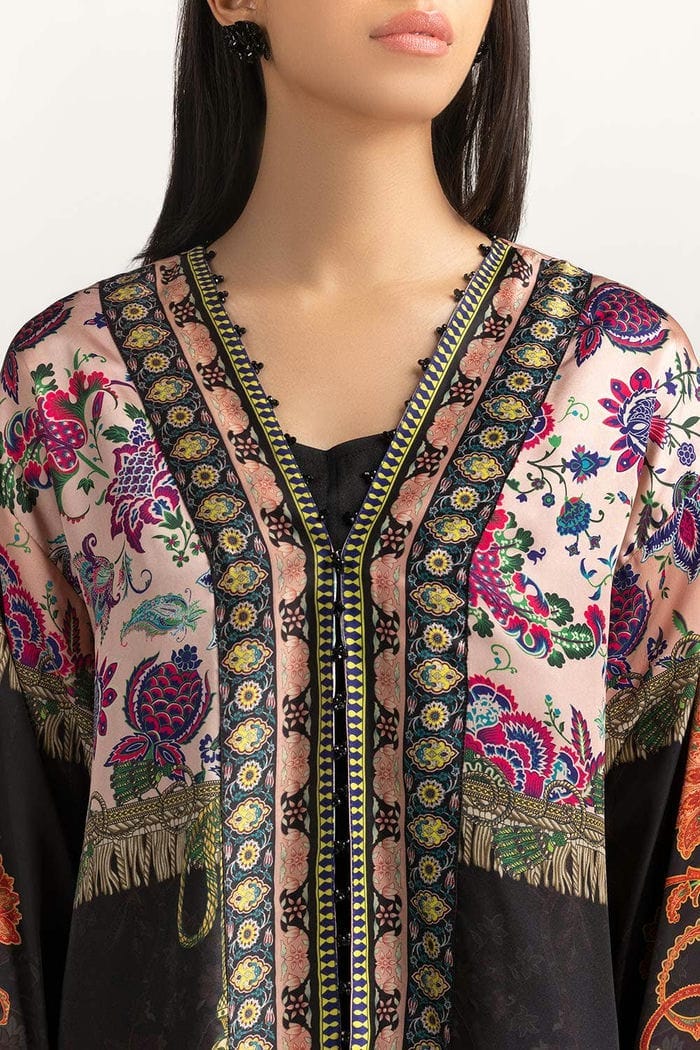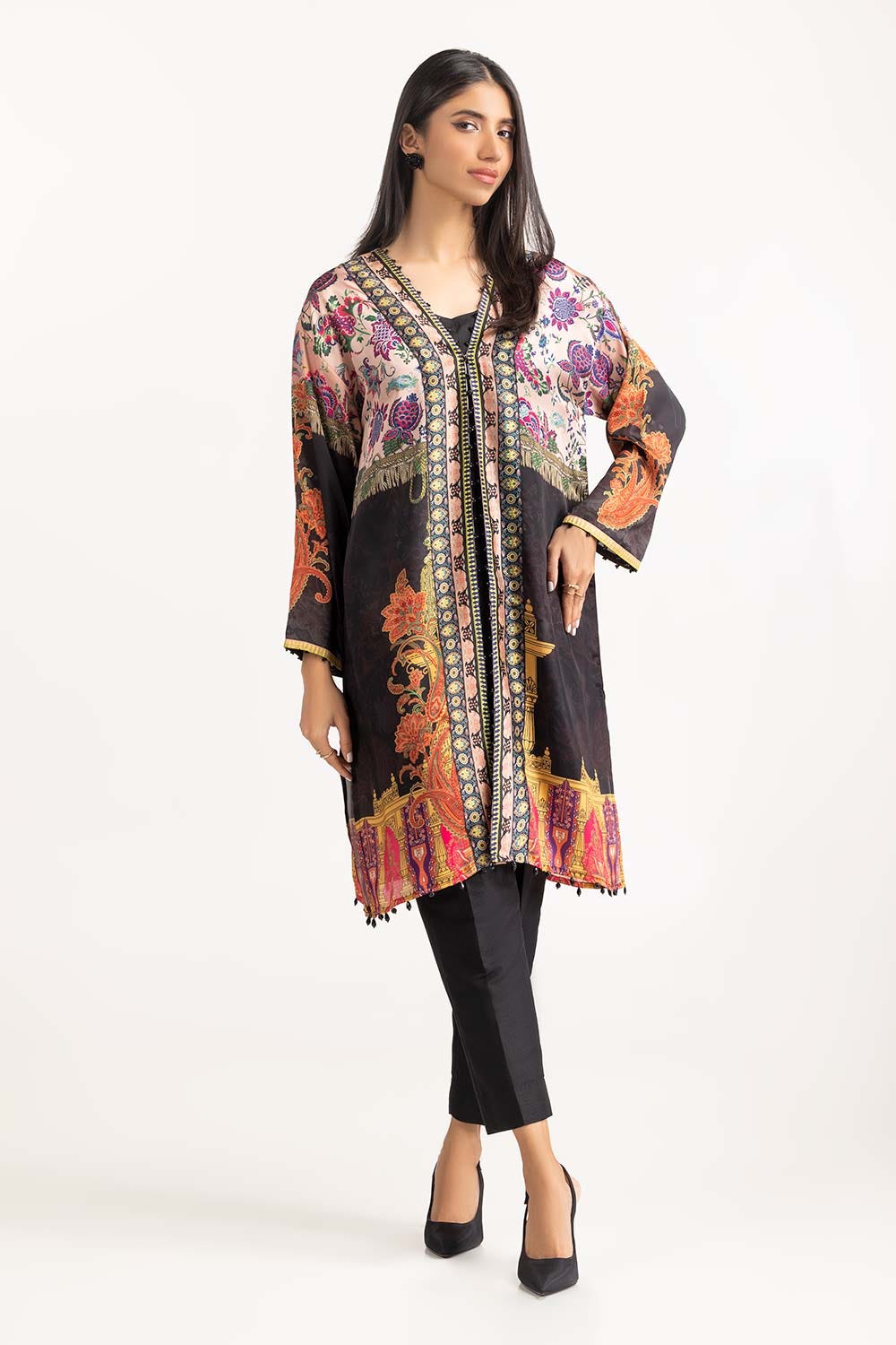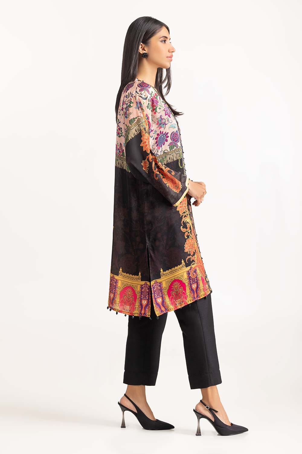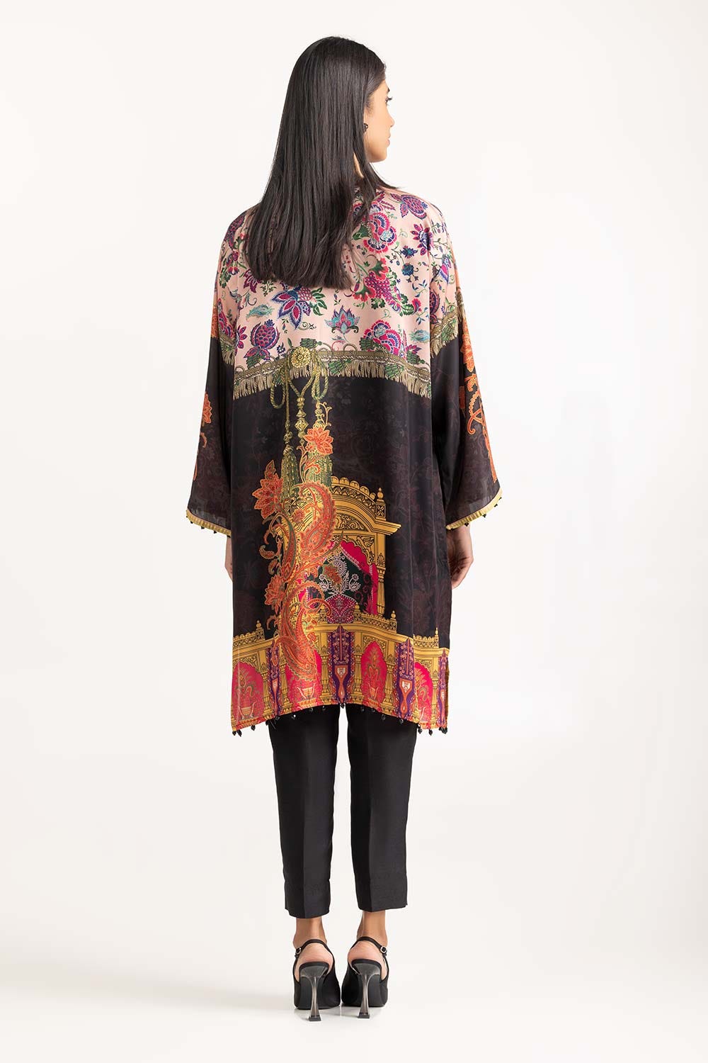 Ready to wear Multi-colored digital printed shamose silk shirt featuring a V neck with detailing, straight sleeves with tassels and a rectangular hem with tassels.