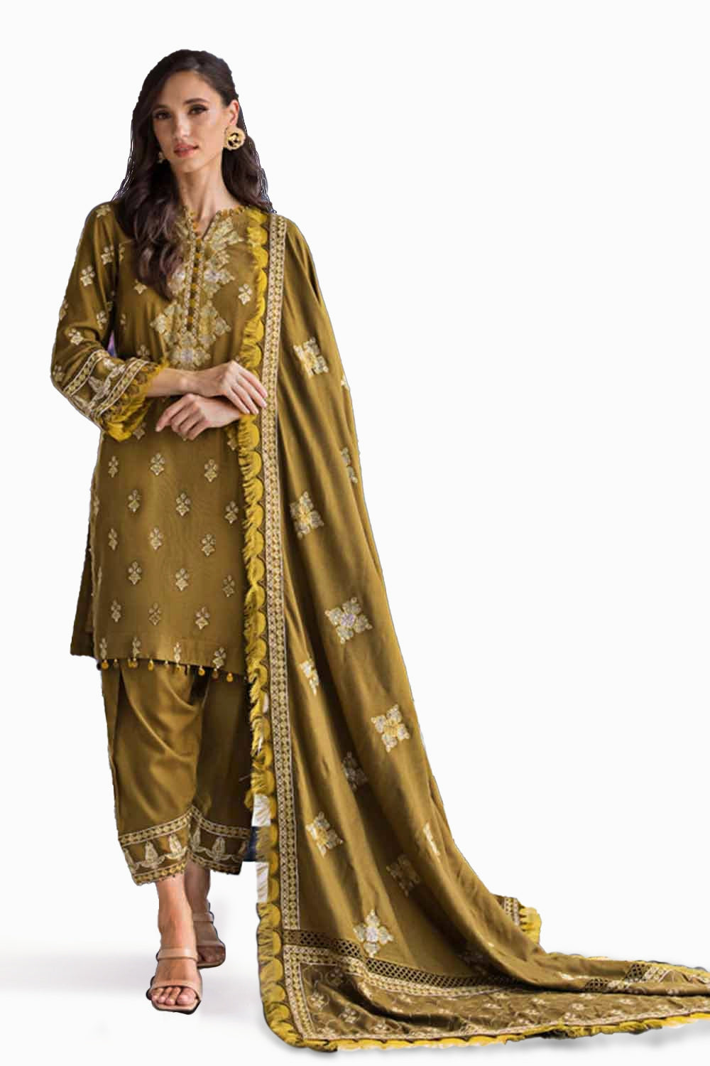 • Embroidered Pashmina Shirt with Embroidered Borders for Front & Back And Embroidered Neckline – 2.78 meters