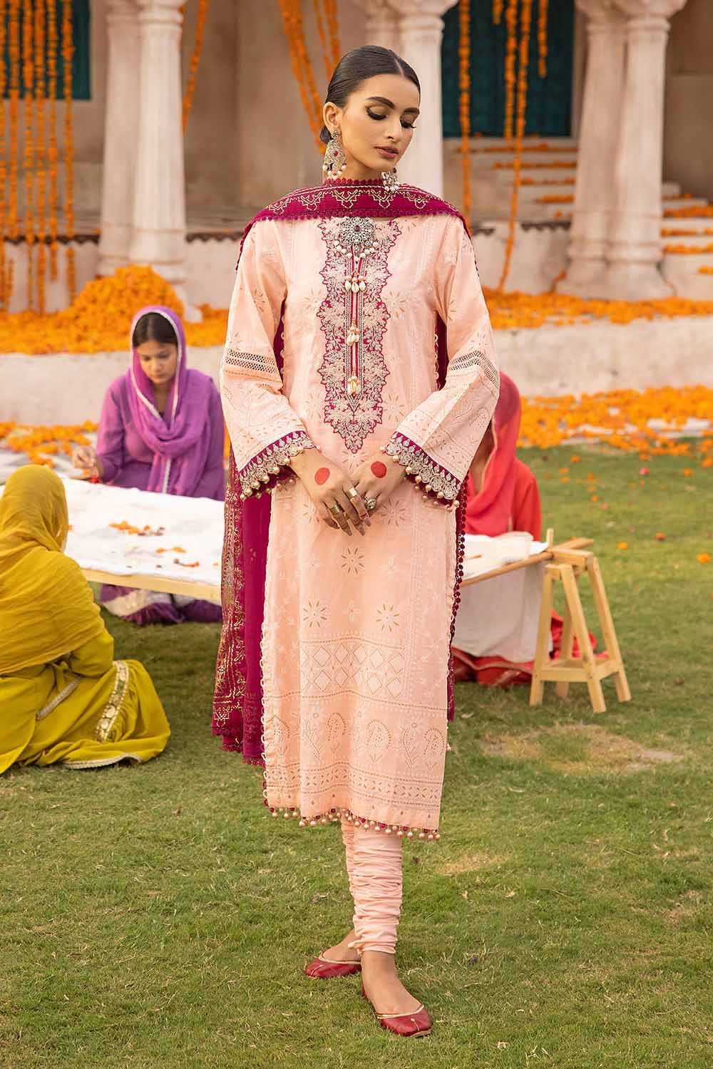 3 Piece Foam and Gold Printed Embroidered Unstitched Lawn Shirt with Foil Printed Chiffon Dupatta BM-32035