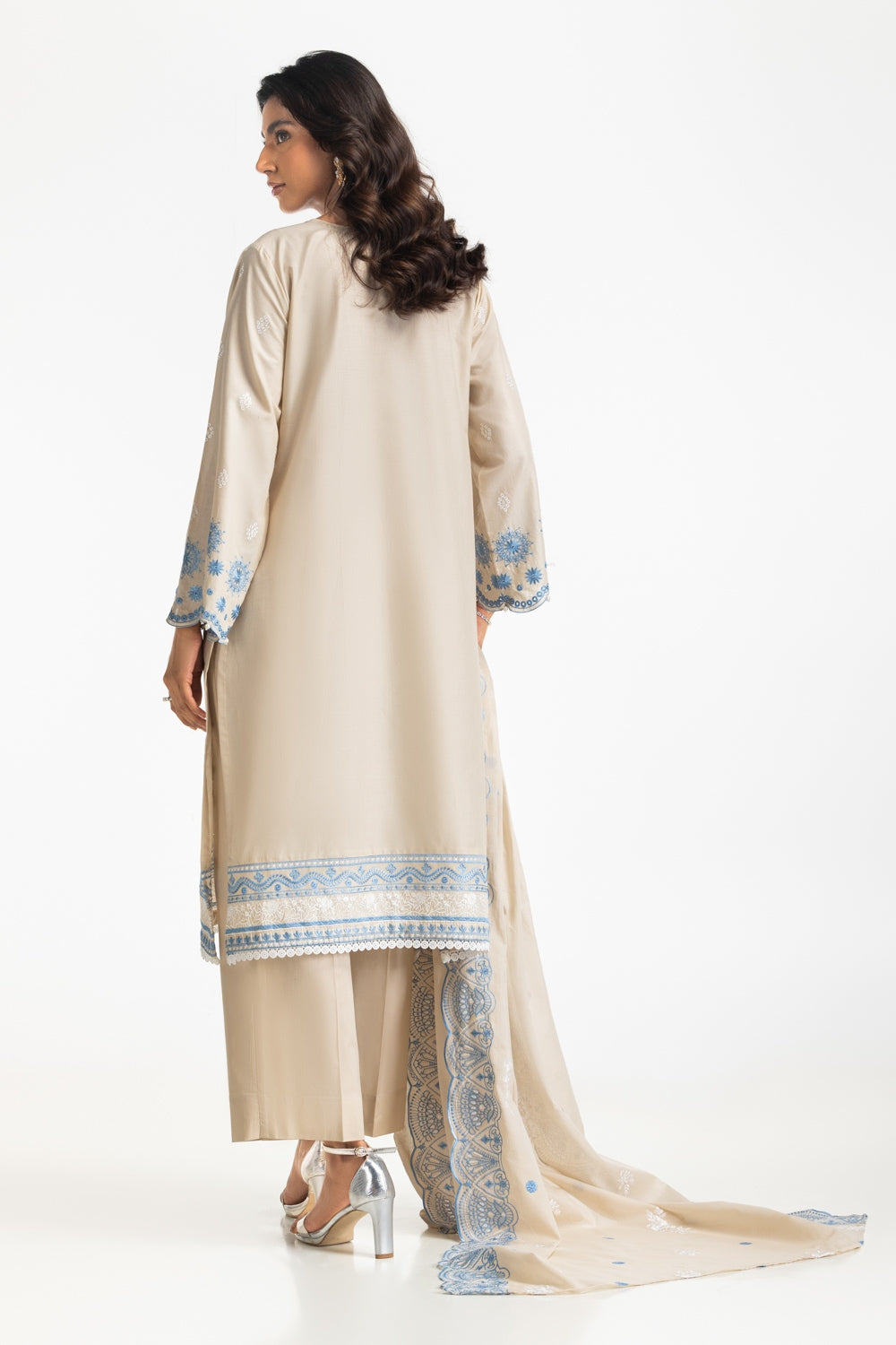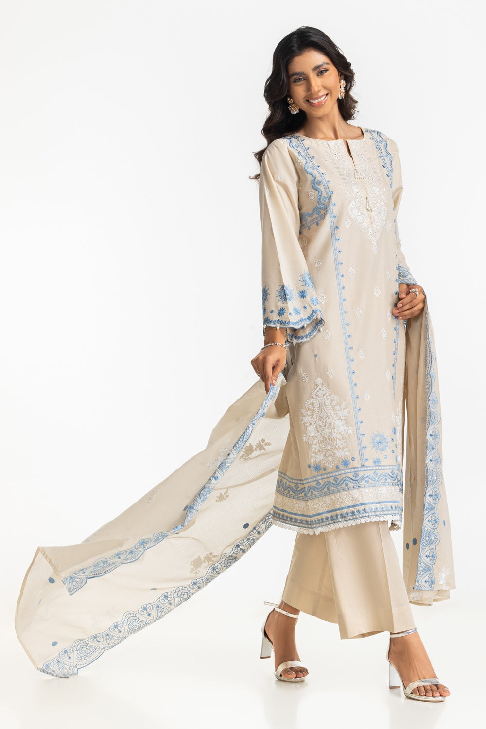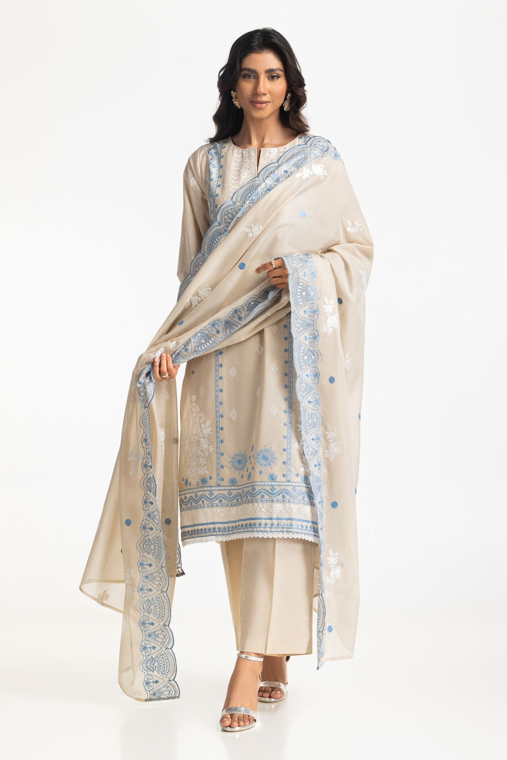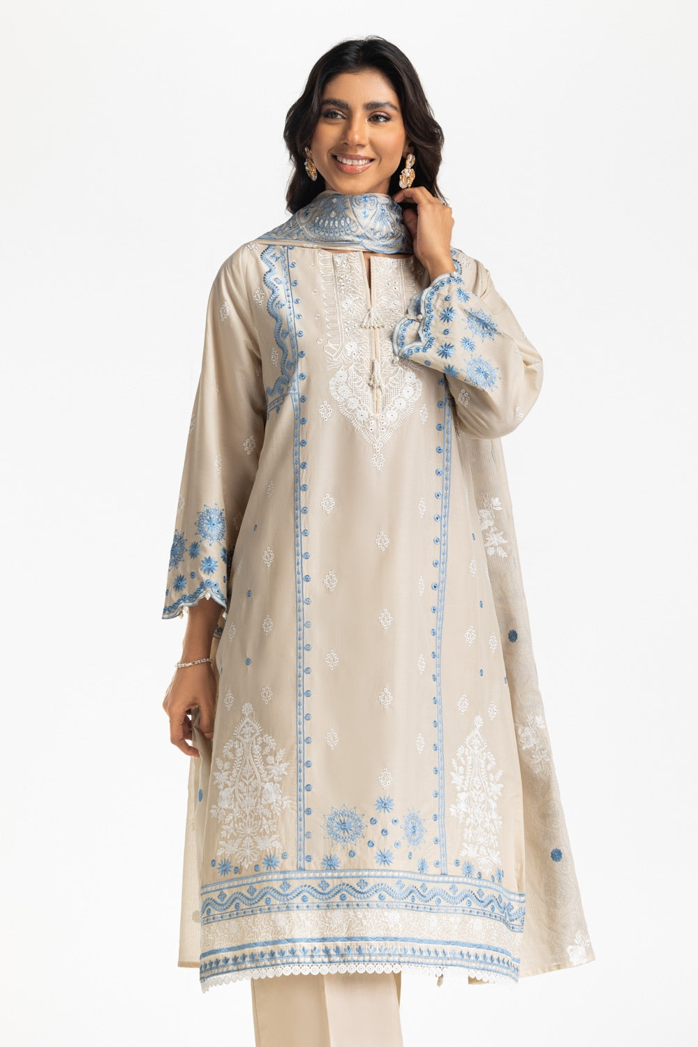 This charming ensemble featuring a stunning embroidered shirt with tassel detailing at the neckline, paired with a matching trouser and embroidered dupatta. The touch of traditional grace with a contemporary twist is perfect for festive occasions and celebrations.