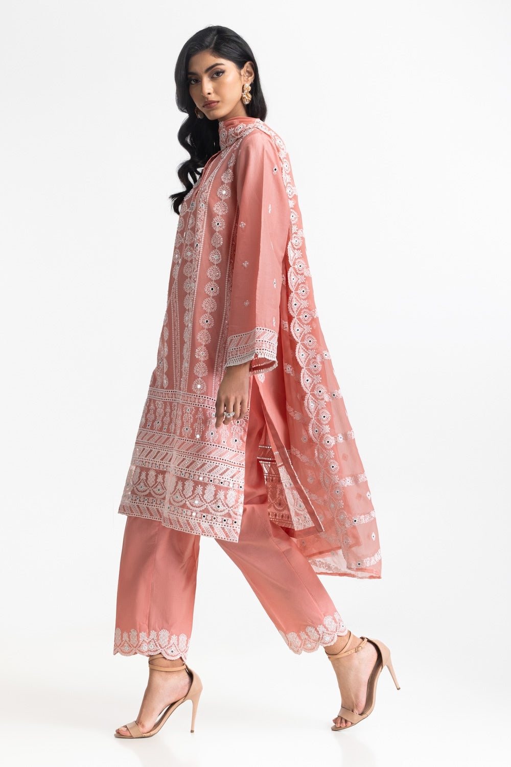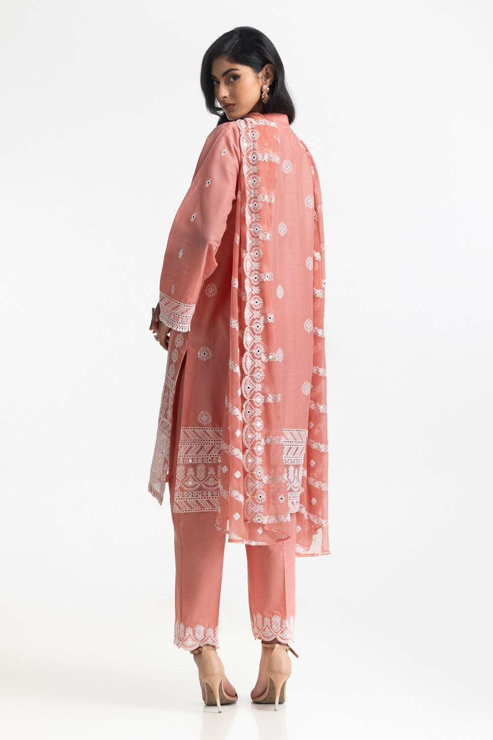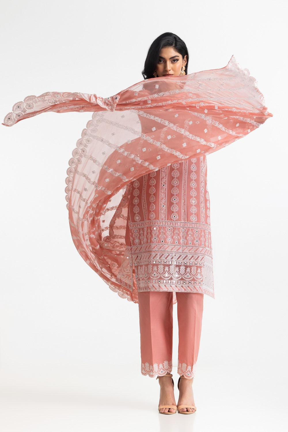 A beautifully crafted outfit featuring a regular fit shirt with intricate embroidery and mirror work with beaded tassels on the neckline. The matching trouser and embroidered dupatta adds a touch of traditional grace, ideal for festive occasions and celebrations.