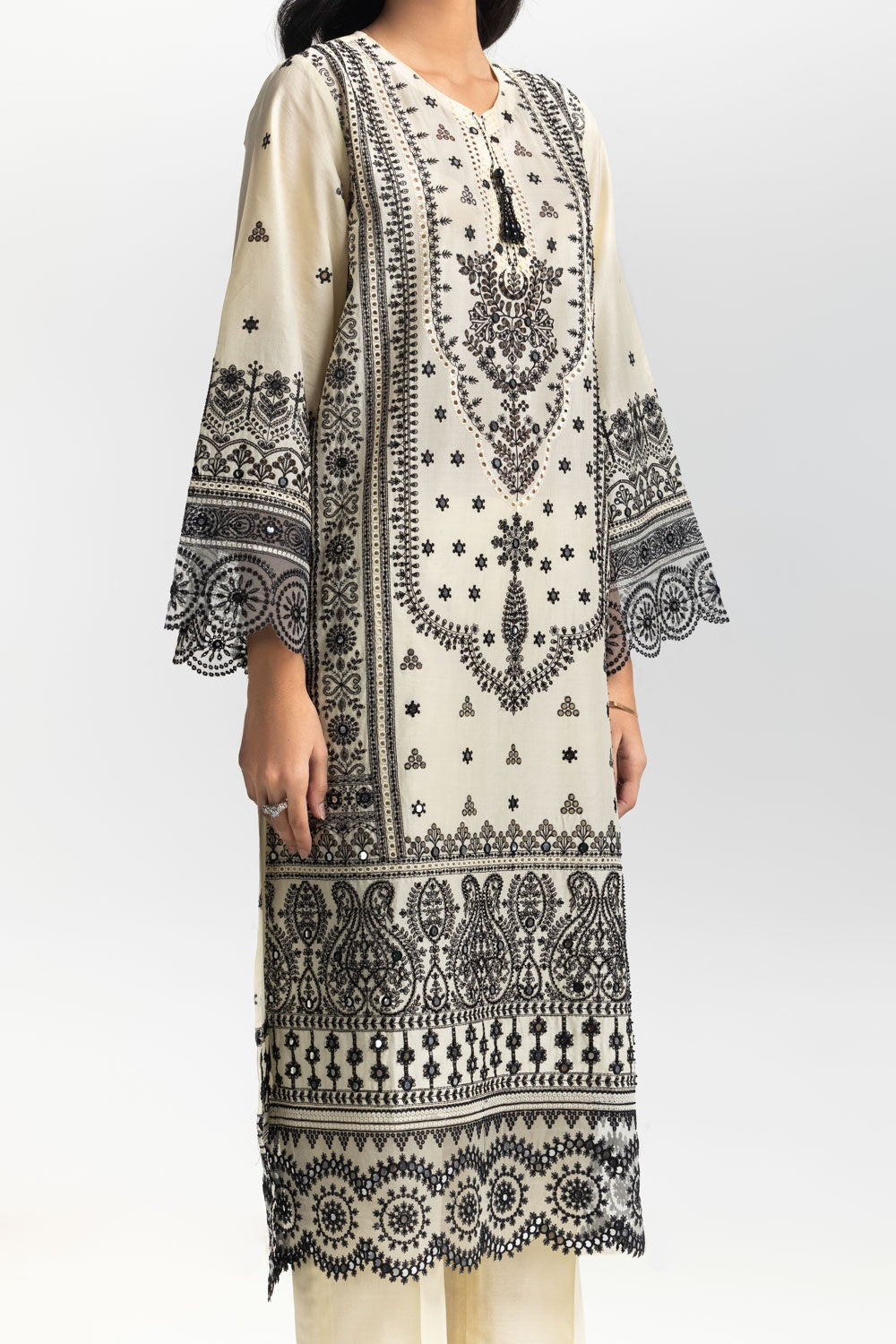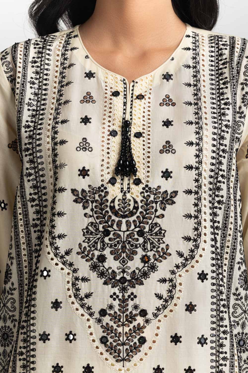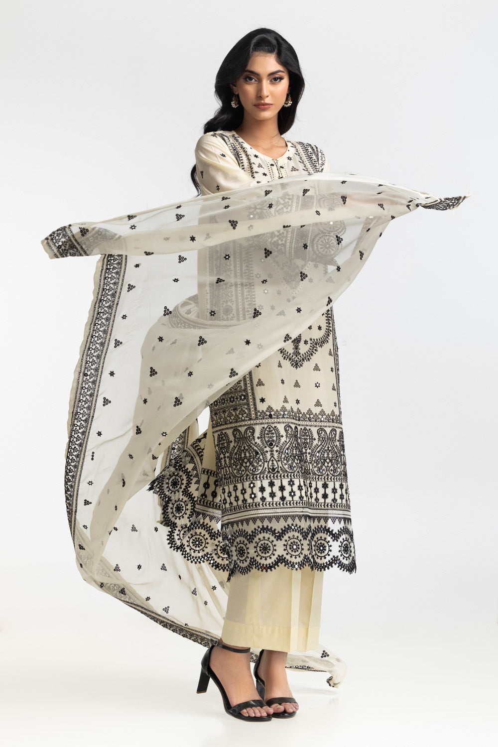 Tailored in a breathable fabric, the outfit features a regular fit shirt adorned with intricate embroidery, pairs perfectly with the embroidered dupatta and matching trousers, Ideal for fancy dinners or festive gatherings all season long.