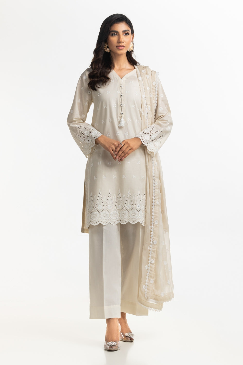 Effortlessly elegant ensemble in a soothing hue featuring a delicately embroidered shirt with a matching trouser, while the embroidered dupatta completes the look for the day.